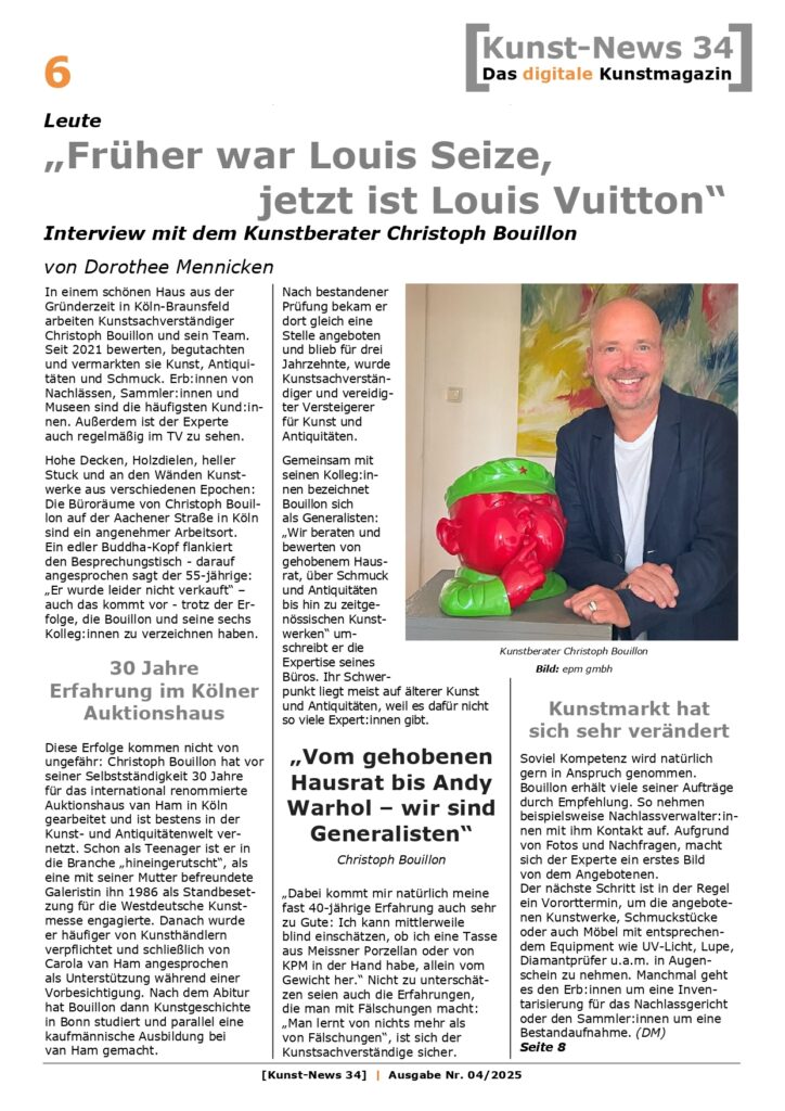 Artikel lesenHohe Decken, Holzdielen, heller Stuck und an den Wänden Kunstwerke aus verschiedenen Epochen: Die Büroräume von Christoph Bouillon auf der Aachener Straße in Köln sind ein angenehmer Arbeitsort. Ein edler Buddha-Kopf flankiert den Besprechungstisch - darauf angesprochen sagt der 55-jährige: „Er wurde leider nicht verkauft“ – auch das kommt vor - trotz der Erfolge, die Bouillon und seine sechs Kolleg:innen zu verzeichnen haben.