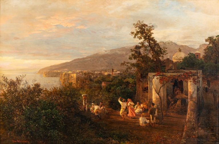 Neapolitanische Küstenlandschaft im Abendlicht mit tanzenden Landleuten an einer Pergola. Öl/Lwd. 100 x 153 cm. Provenienz: Schloss Rimburg.
