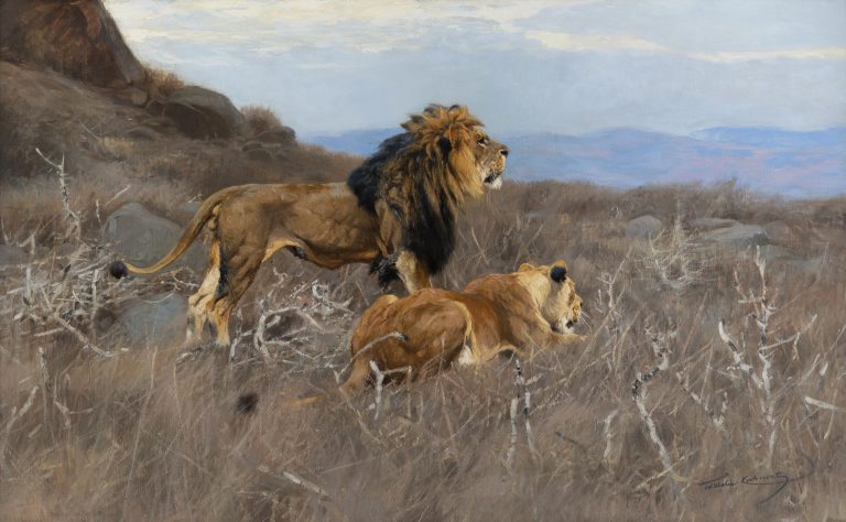 Löwen auf dem Raubzug. Öl auf Leinwand. 86x139cm. Aus dem Nachlass des Künstlers
