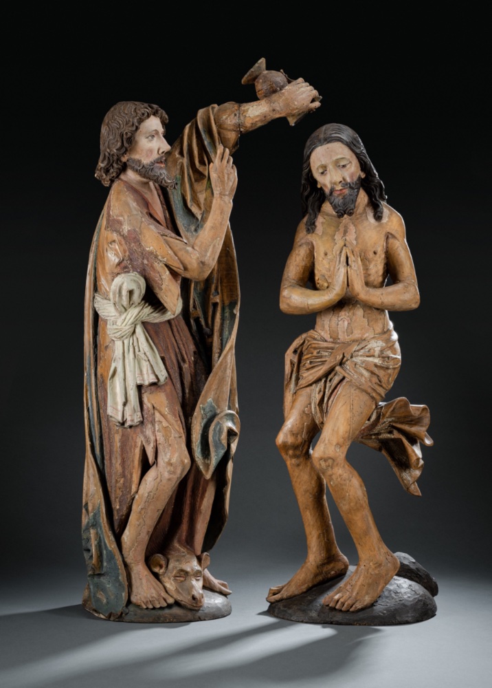 Bedeutende Taufgruppe - Taufe Christi.. Linde, H. 91/101 cm. Provenienz: Schloss Proschwitz.