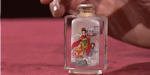 Feine Hinterglasmalerei mit allerlei symbolischen Motiven nach alter chinesischer Tradition ziert dieses Schnupftabakfläschchen, bemalt im späten 20. Jahrhundert. Sendung vom 16….