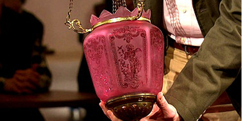 An byzantinische Leuchten erinnert diese, durch die Beimischung von Mangan, dunkelrot eingefärbte Ampel aus dem Jahr 1919, deren Dekor einen Paradiesgarten assoziiert. Sendung vom…